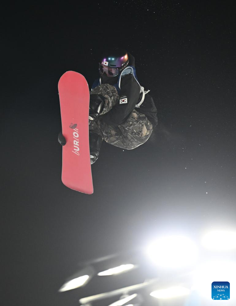 Yu Seungeun of South Korea competes during the snowboard women's big air final match at the Milan-Cortina 2026 Olympic Winter Games in Livigno, Italy, Feb. 9, 2026. (Xinhua/Xia Yifang)
