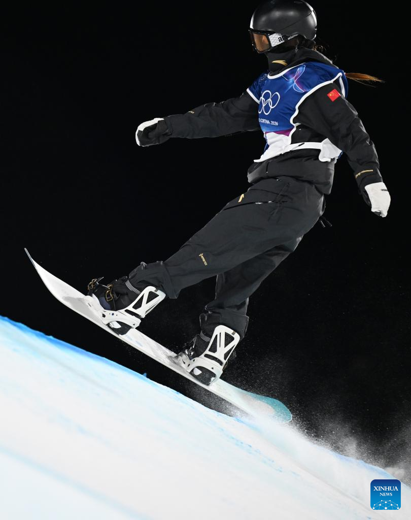 Zhang Xiaonan of China competes during the snowboard women's big air final match at the Milan-Cortina 2026 Olympic Winter Games in Livigno, Italy, Feb. 9, 2026. (Xinhua/Wu Huiwo)