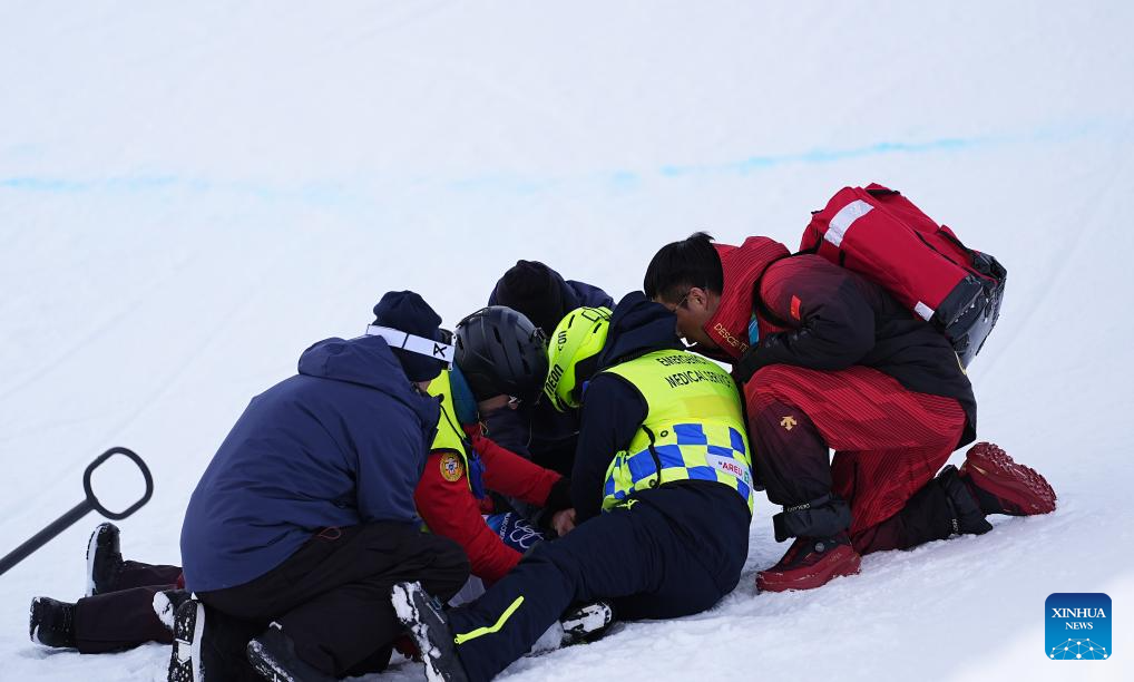 Liu, who remained motionless for several minutes, was placed on a rescue sled and transported by medical staff to the on-site medical center.