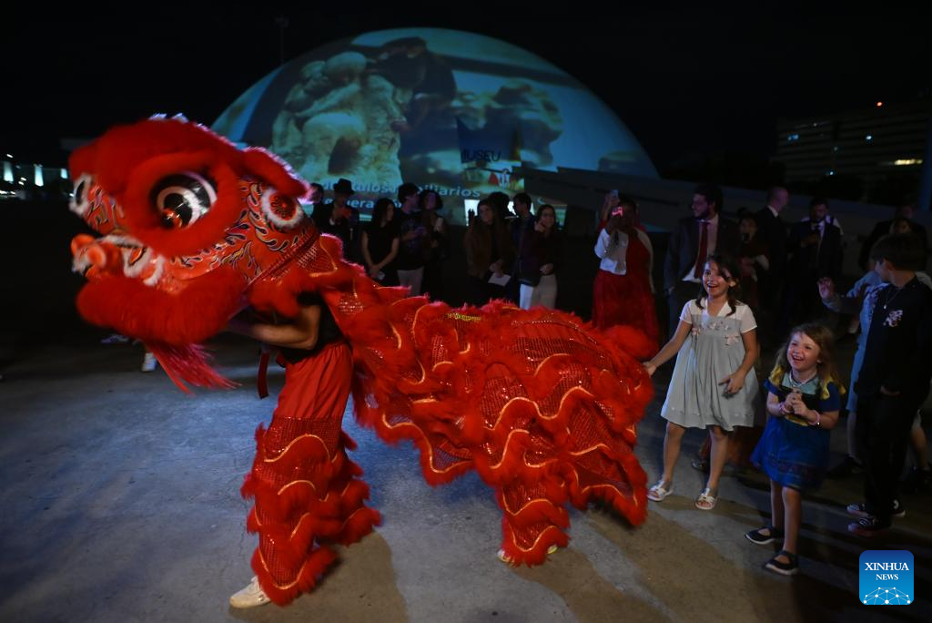 People enjoy a lion dance performance to celebrate the upcoming Spring Festival in Brasilia, Brazil, Feb. 10, 2026. (Photo by Lucio Tavora/Xinhua)