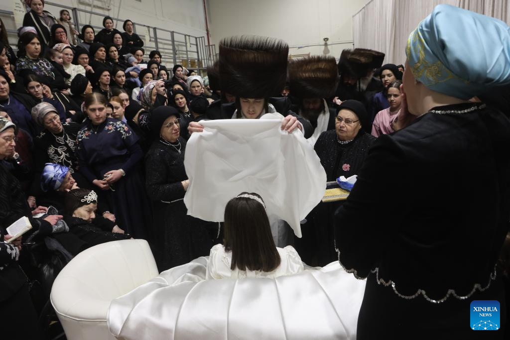 This photo taken on Feb. 9, 2026 shows the scene of a traditional Jewish wedding in an Ultra-Orthodox Jewish community near Jerusalem. A newly-wed Jewish couple celebrated their traditional wedding in a community near Jerusalem from Monday night till Tuesday morning.