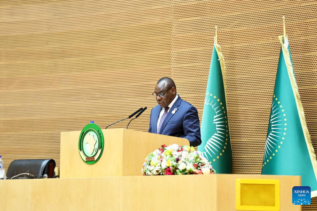 Ethiopian Foreign Minister Gedion Timothewos speaks during the 48th Ordinary Session of the Executive Council of the African Union (AU) at the AU headquarters in Addis Ababa, Ethiopia, on Feb. 11, 2026. The 48th Ordinary Session of the Executive Council of the AU kicked off Wednesday at the AU headquarters in Addis Ababa, the capital of Ethiopia. (Xinhua/Geng Xinning)