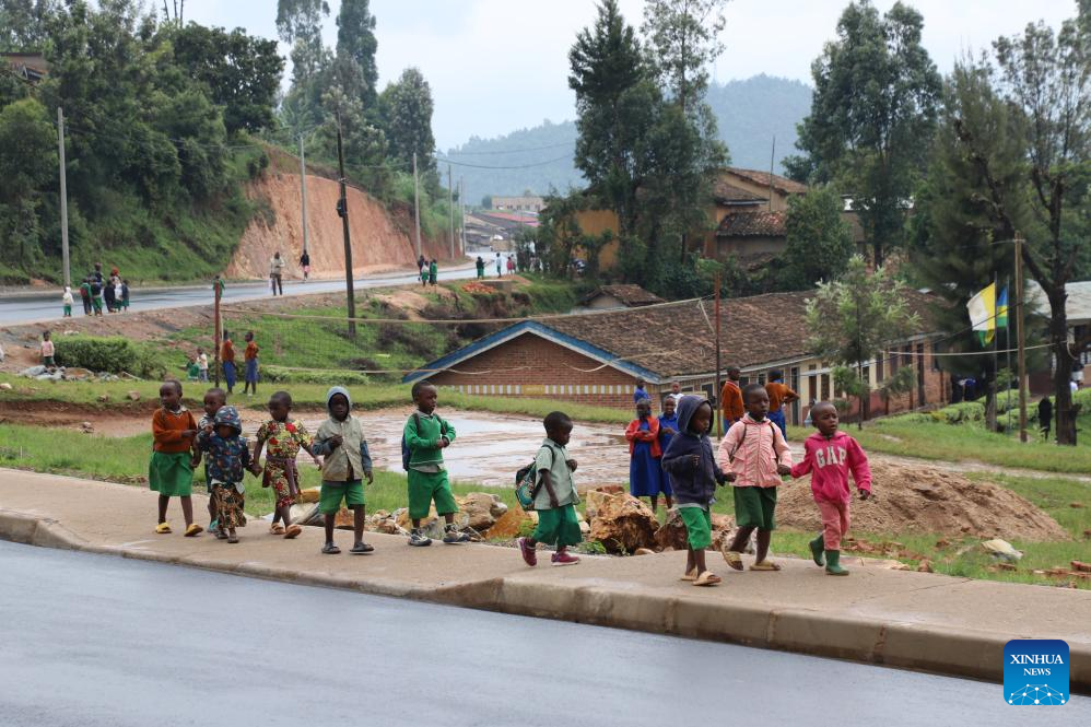 This photo taken on Feb. 9, 2026 shows children walking alongside the Nyange-Muhanga road constructed by China's Stecol Corporation in Muhanga District, Rwanda. (Xinhua/Ju Yinhe)