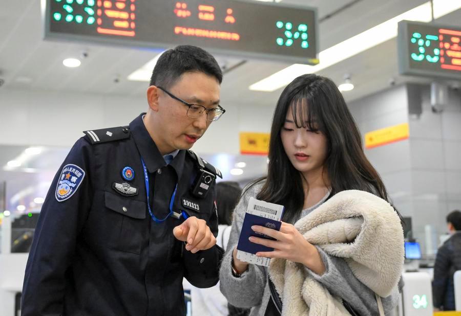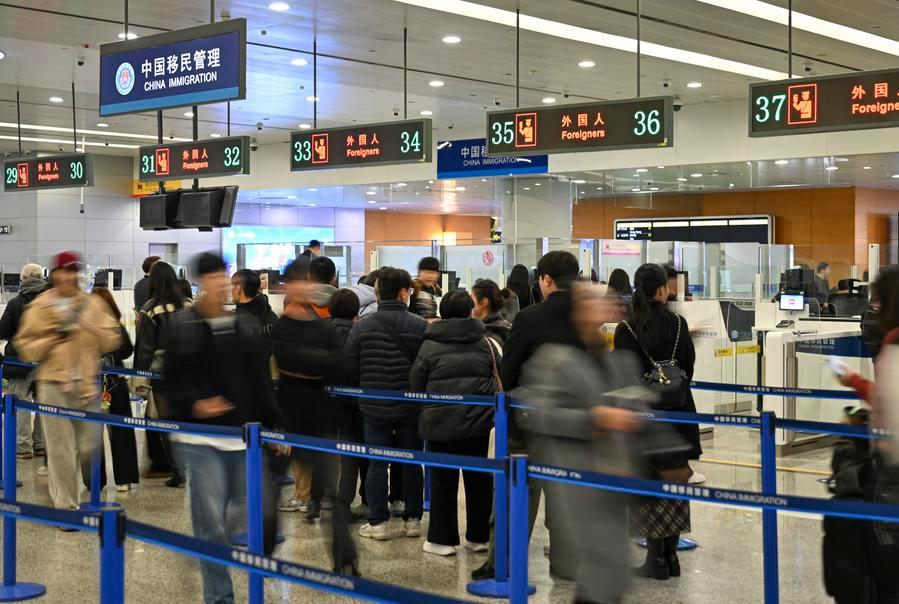 Tourists fill in entry information at Shanghai Pudong International Airport in Shanghai, east China, on Feb. 11, 2026. (Xinhua/Chen Haoming)A border inspection police officer helps a South Korean tourist fill in entry information at Shanghai Pudong International Airport in Shanghai, east China, on Feb. 11, 2026. (Xinhua/Chen Haoming)Tourists wait for customs clearance at Shanghai Pudong International Airport in Shanghai, east China, on Feb. 11, 2026. (Xinhua/Chen Haoming)A tourist goes through entry procedures at Shanghai Pudong International Airport in Shanghai, east China, on Feb. 11, 2026. (Xinhua/Chen Haoming)A family from the United States pose for photos at Shanghai Pudong International Airport in Shanghai, east China, on Feb. 11, 2026. (Xinhua/Chen Haoming)■