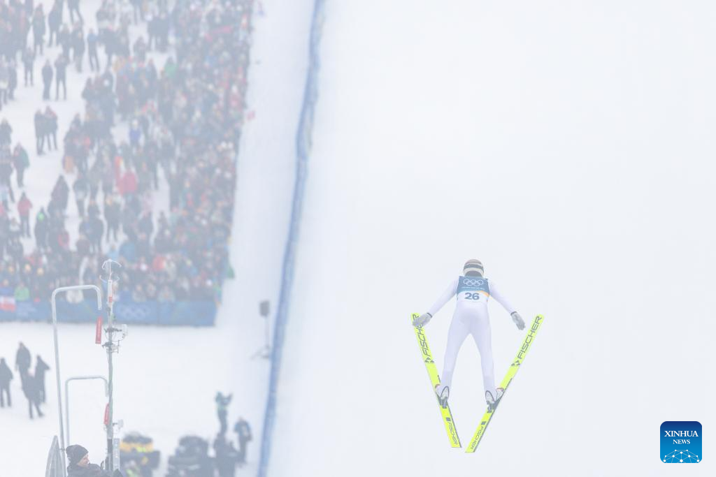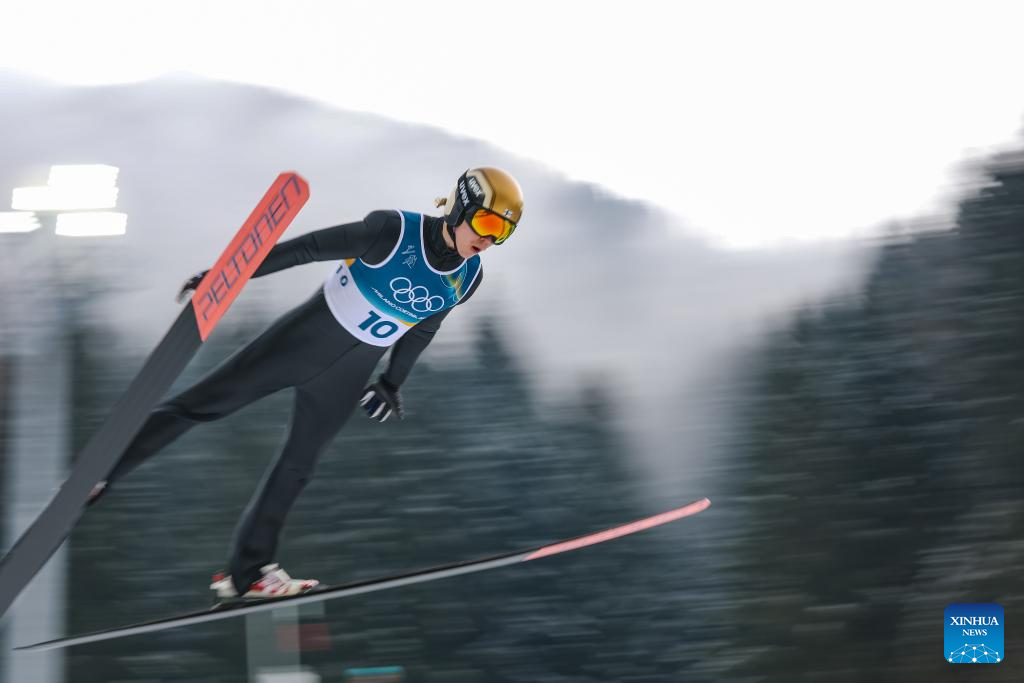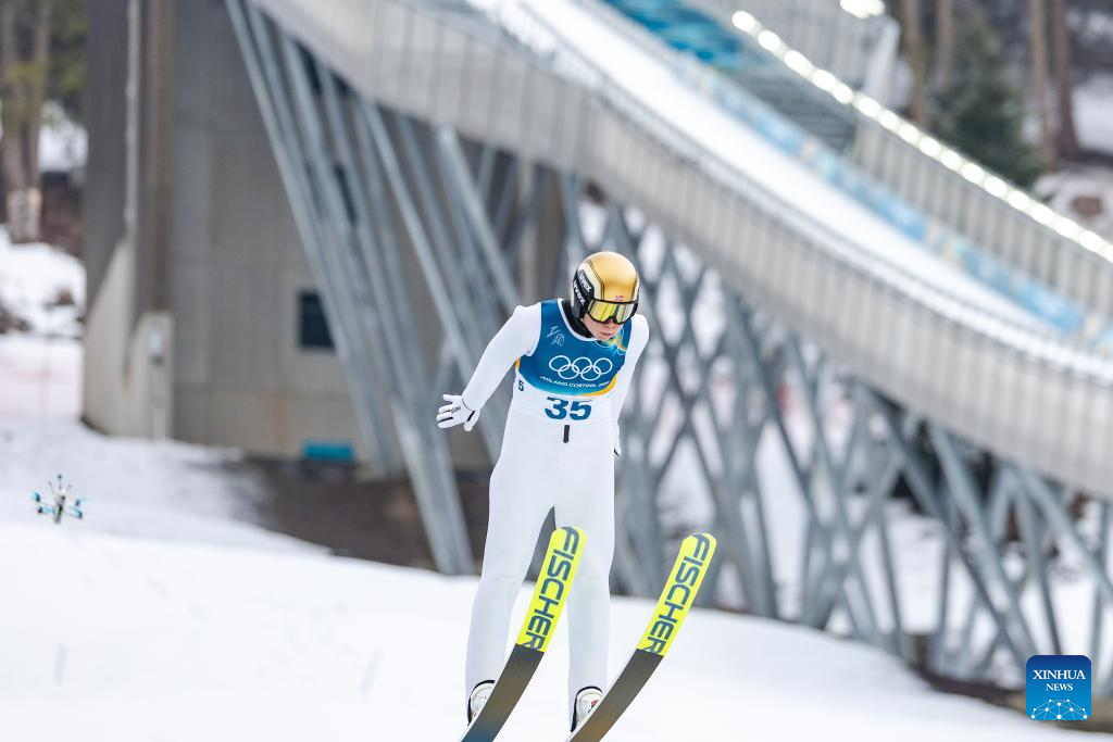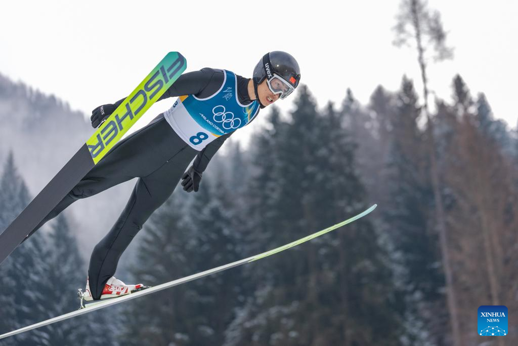 Zhao Jiawen of China competes during the Nordic Combined Individual Gundersen Normal Hill/10km at the 2026 Milan-Cortina Winter Olympics in Predazzo, Italy, Feb. 11, 2026. (Xinhua/Meng Yongmin)