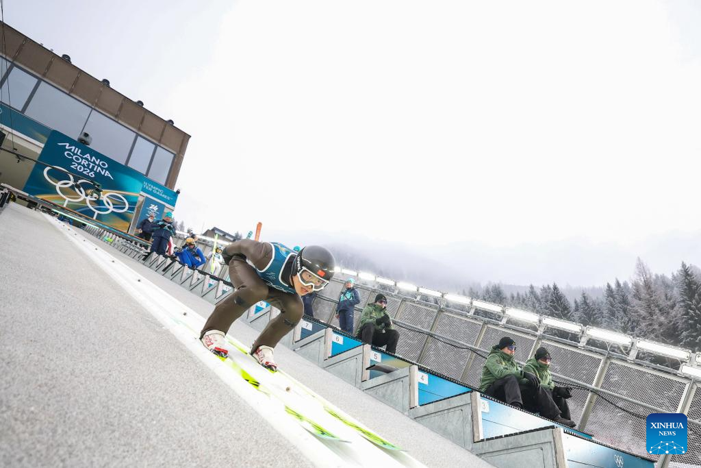 Zhao Zihe of China competes during the Nordic Combined Individual Gundersen Normal Hill/10km at the 2026 Milan-Cortina Winter Olympics in Predazzo, Italy, Feb. 11, 2026. (Xinhua/Meng Yongmin)