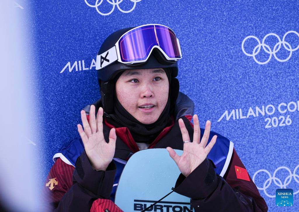 Wu Shaotong of China reacts during the snowboard women's halfpipe qualification at the Milan-Cortina 2026 Olympic Winter Games in Livigno, Italy, Feb. 11, 2026. (Xinhua/Wu Huiwo)
