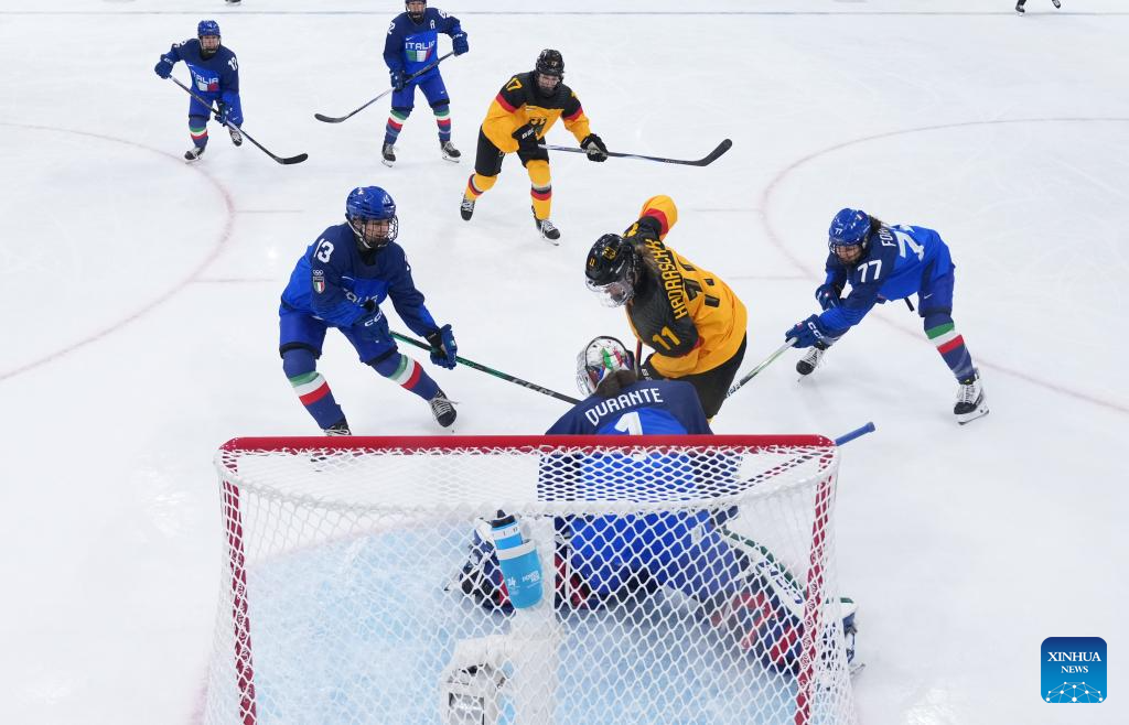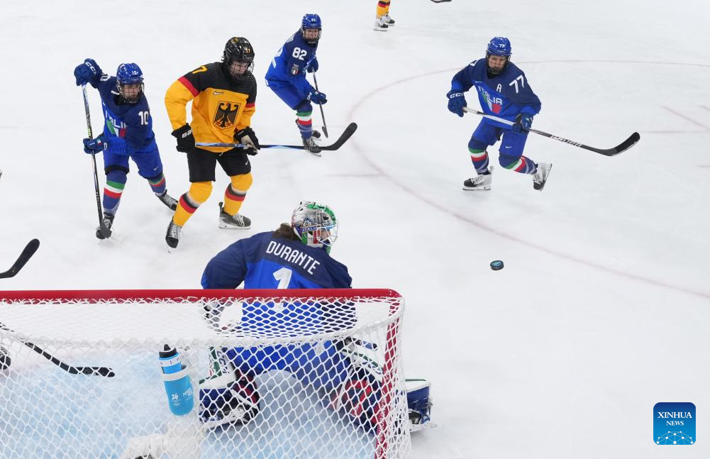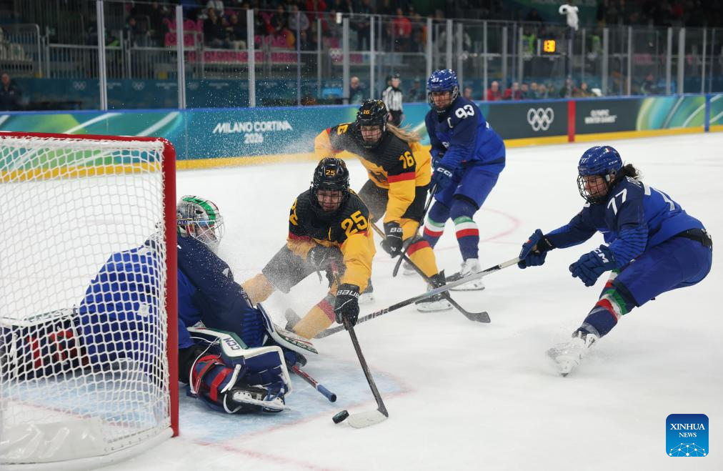 Players of both teams compete during the ice hockey women's preliminary round group B match between Germany and Italy of the Milan-Cortina 2026 Olympic Winter Games in Milan, Italy, Feb. 10, 2026. (Xinhua/Wang Kaiyan)