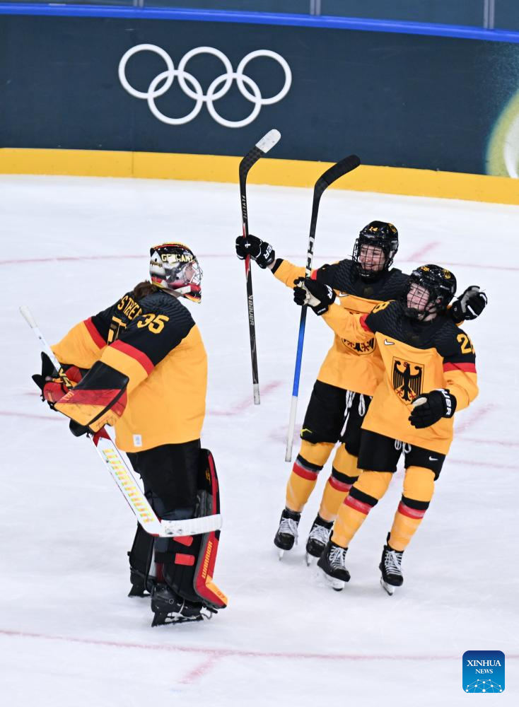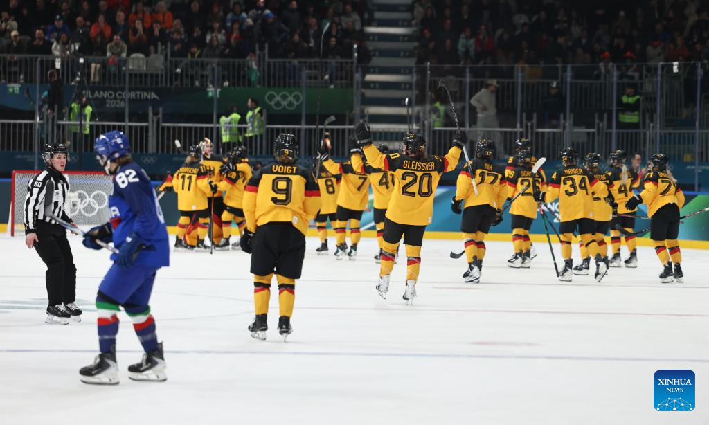 Players of Germany celebrate winning the ice hockey women's preliminary round group B match between Germany and Italy of the Milan-Cortina 2026 Olympic Winter Games in Milan, Italy, Feb. 10, 2026. (Xinhua/Wang Kaiyan)