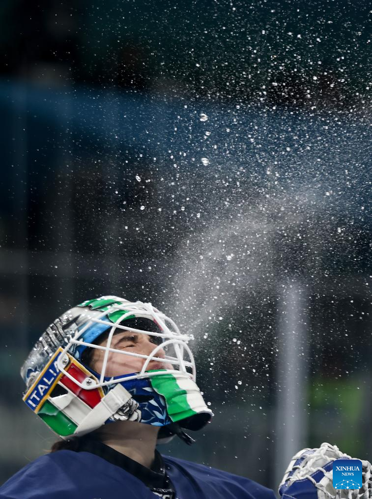 Goalkeeper Martina Fedel of Italy reacts during the ice hockey women's preliminary round group B match between Germany and Italy of the Milan-Cortina 2026 Olympic Winter Games in Milan, Italy, Feb. 10, 2026. (Xinhua/Wang Kaiyan)