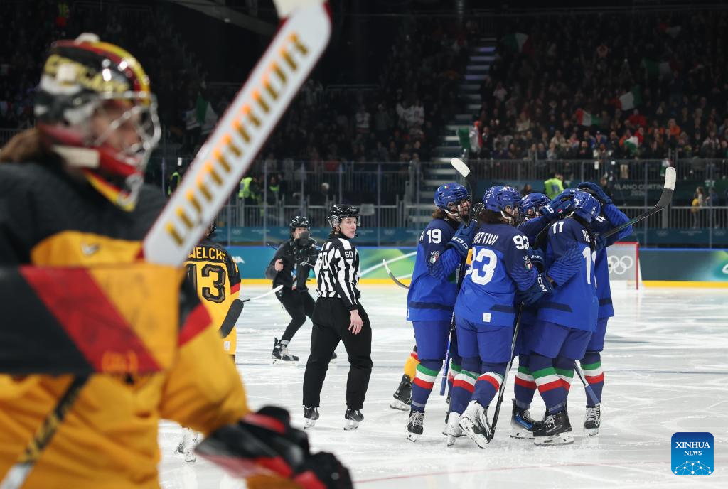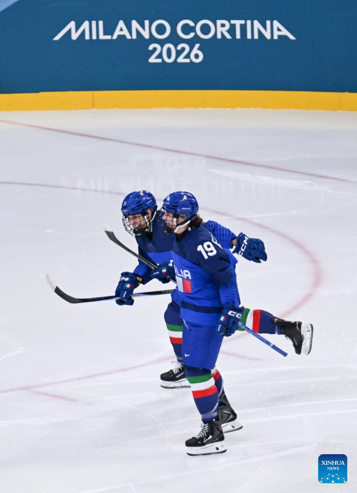 Players of Italy celebrate a goal during the ice hockey women's preliminary round group B match between Germany and Italy of the Milan-Cortina 2026 Olympic Winter Games in Milan, Italy, Feb. 10, 2026. (Xinhua/Tao Xiyi)