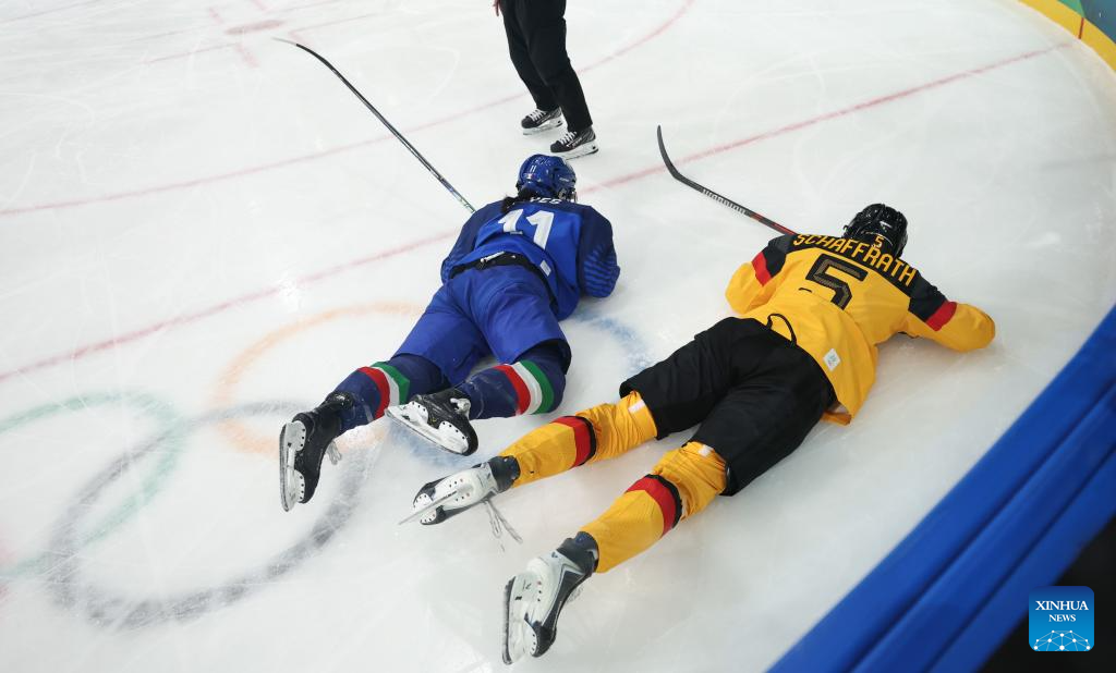 Justine Reyes (L) of Italy and Charlott Schaffrath of Germany fall during the ice hockey women's preliminary round group B match between Germany and Italy of the Milan-Cortina 2026 Olympic Winter Games in Milan, Italy, Feb. 10, 2026. (Xinhua/Wang Kaiyan)