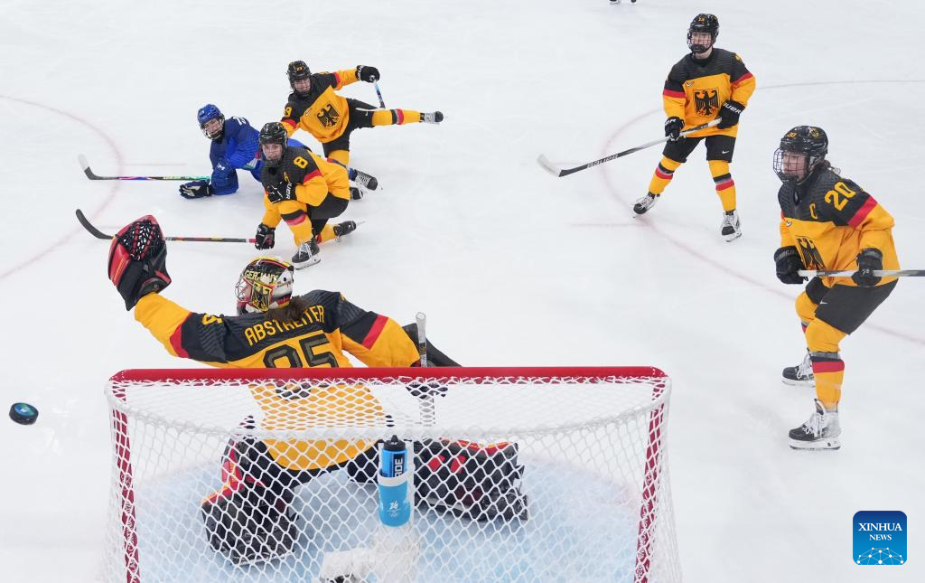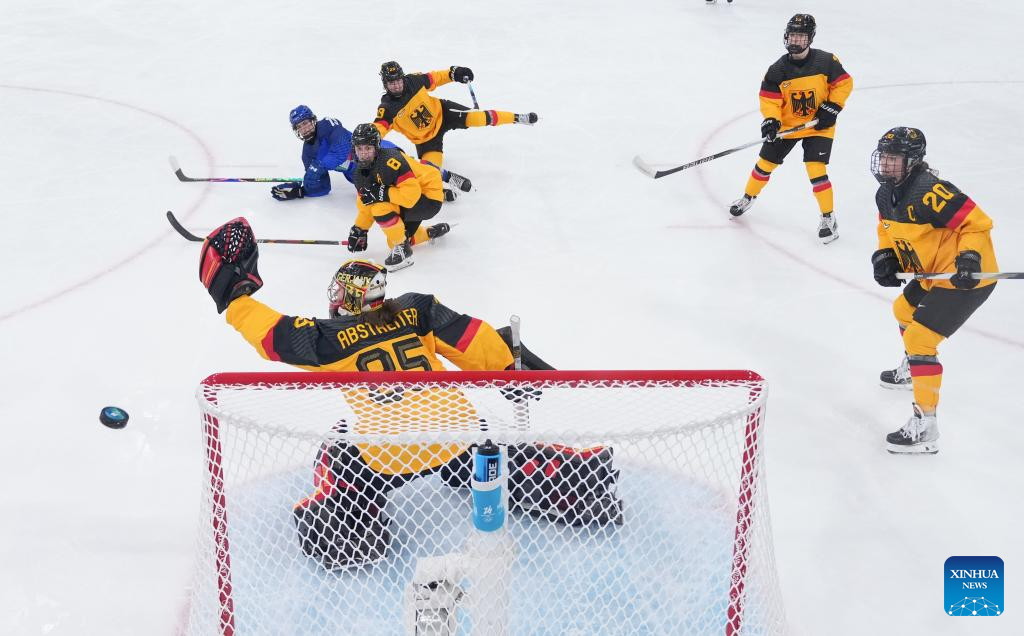 Goalkeeper Sandra Abstreiter (front L) of Germany saves during the ice hockey women's preliminary round group B match between Germany and Italy of the Milan-Cortina 2026 Olympic Winter Games in Milan, Italy, Feb. 10, 2026. (Xinhua/Wang Kaiyan)