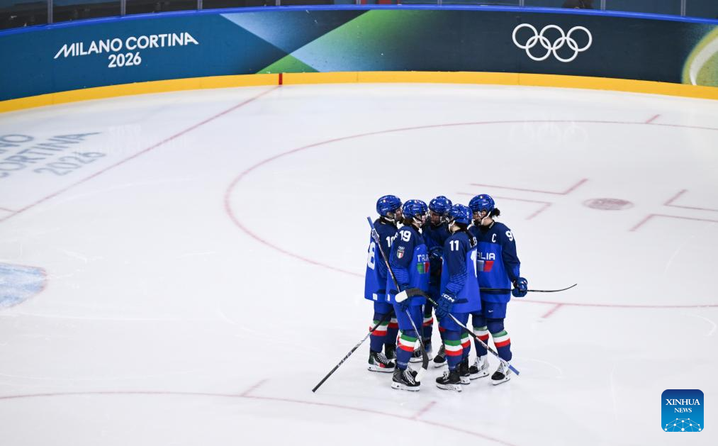 Players of Italy gather together before a period during the ice hockey women's preliminary round group B match between Germany and Italy of the Milan-Cortina 2026 Olympic Winter Games in Milan, Italy, Feb. 10, 2026. (Xinhua/Tao Xiyi)