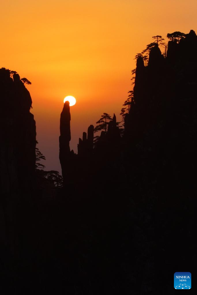 An aerial drone photo taken on Feb. 11, 2026 shows the scenery of the Huangshan Mountain scenic area at sunrise, in east China's Anhui Province. (Photo by Fan Chengzhu/Xinhua)