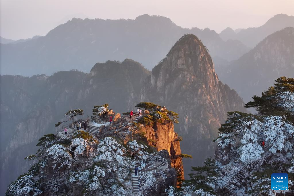 An aerial drone photo taken on Feb. 11, 2026 shows tourists enjoying the scenery of the Huangshan Mountain scenic area at sunrise after snow, in east China's Anhui Province. (Photo by Fan Chengzhu/Xinhua)