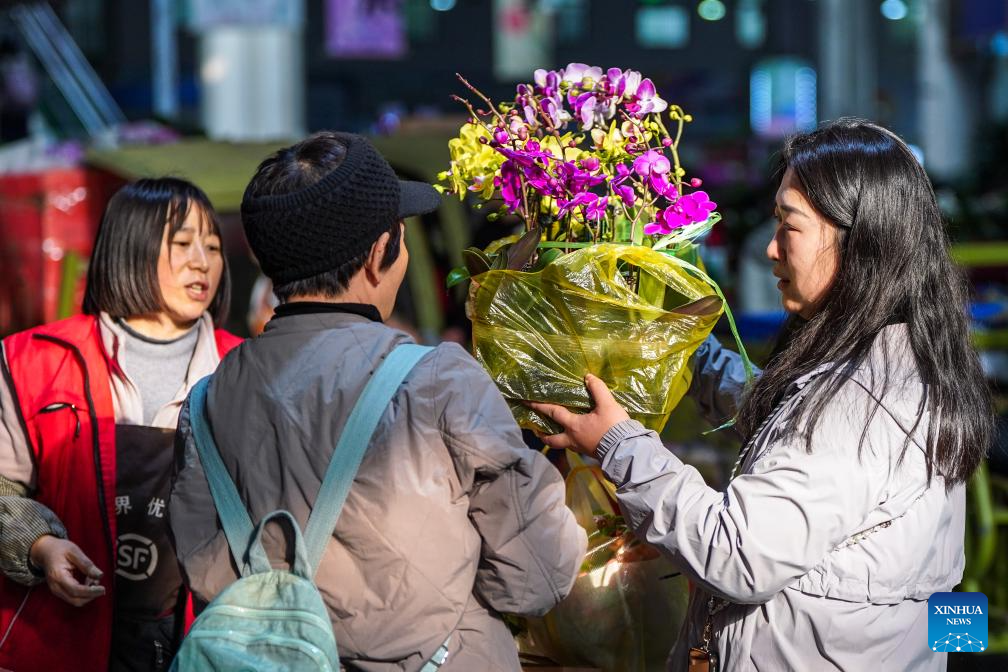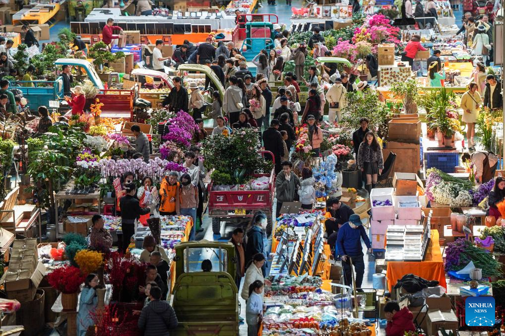 People buy flowers at Dounan Flower Market in Kunming, southwest China's Yunnan Province, Feb. 10, 2026. As the Spring Festival approaches, the Dounan Flower Market in Kunming, dubbed the "flower capital of Asia," is gradually heating up. (Xinhua/Peng Yikai)