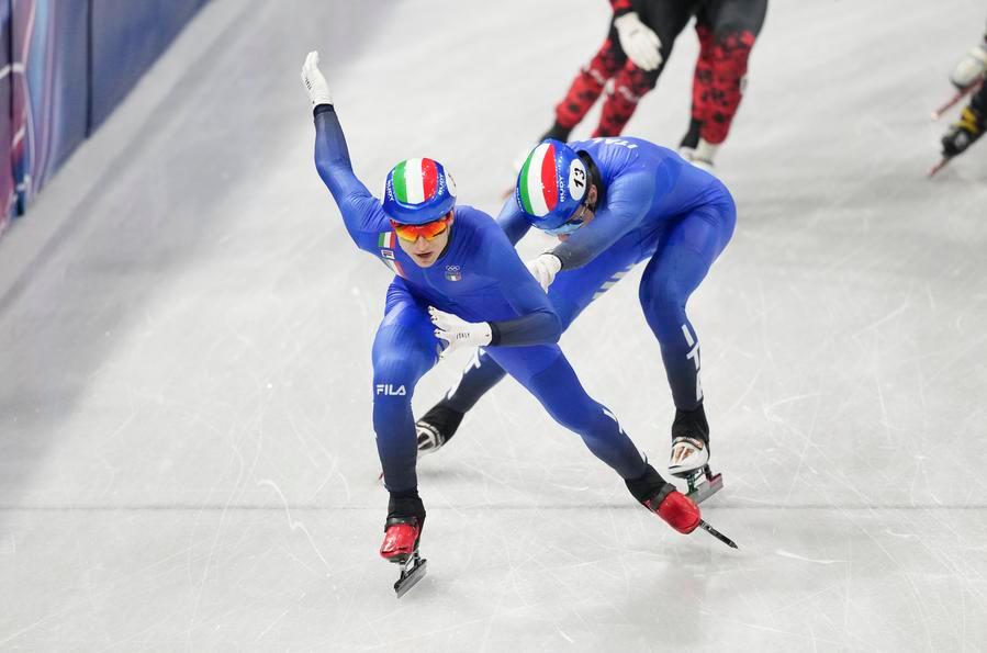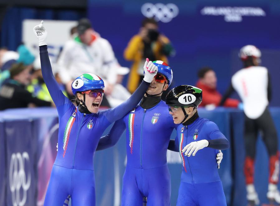Members of team Italy celebrate after the short track speed skating mixed team relay final A at the Milan-Cortina 2026 Olympic Winter Games in Milan, Italy, Feb. 10, 2026. (Xinhua/Li Ming)Gold medalists team Italy celebrate during the awarding ceremony for the short track speed skating mixed team relay at the Milan-Cortina 2026 Olympic Winter Games in Milan, Italy, Feb. 10, 2026. (Xinhua/Li Ming)Pietro Sighel (L) and Thomas Nadalini of Italy compete during the short track speed skating mixed team relay final A at the Milan-Cortina 2026 Olympic Winter Games in Milan, Italy, Feb. 10, 2026. (Xinhua/Xue Yuge)