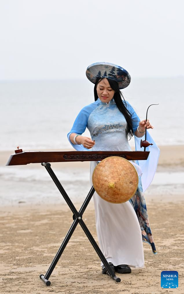 Su Haizhen plays the Duxianqin on Jintan Beach in Dongxing City, south China's Guangxi Zhuang Autonomous Region, Feb. 7, 2026. On Jintan Beach in Dongxing City of south China's Guangxi Zhuang Autonomous Region, Su Haizhen plays the Duxianqin, or single-stringed musical instrument, showcasing the unique charm of the Jing ethnic group's special instrument.