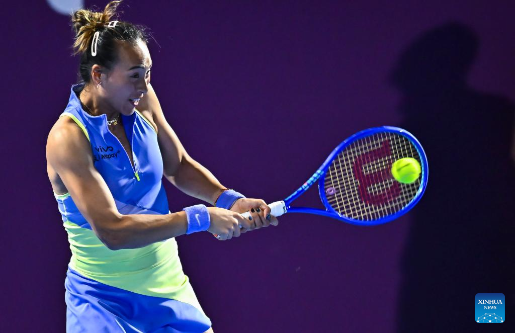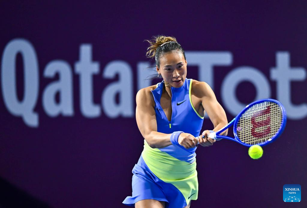Zheng Qinwen of China hits a return during the women's singles round of 32 match between Zheng Qinwen of China and Alycia Parks of the United States at the WTA Qatar Open 2026 tennis tournament in Doha, Qatar, on Feb. 10, 2026. (Photo by Nikku/Xinhua)