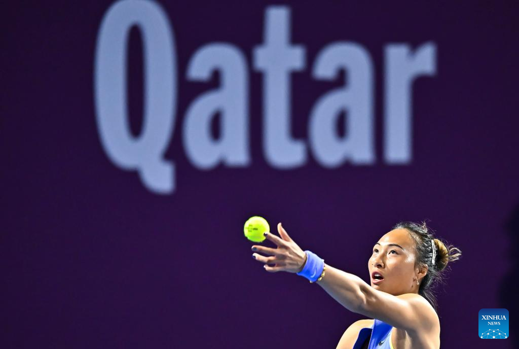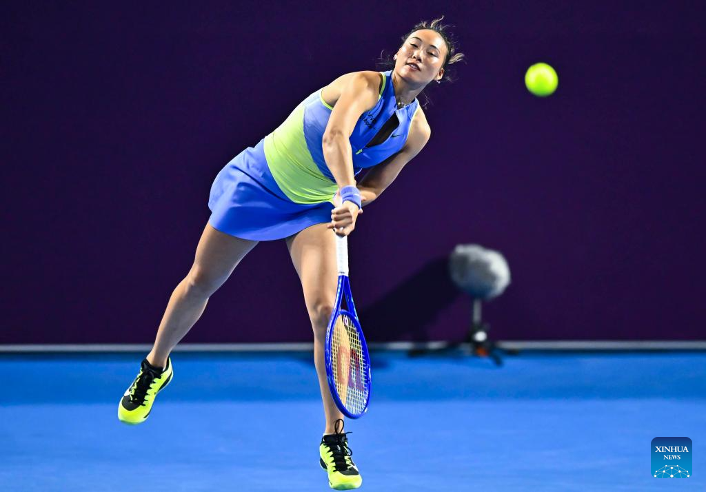 Zheng Qinwen of China serves a ball during the women's singles round of 32 match between Zheng Qinwen of China and Alycia Parks of the United States at the WTA Qatar Open 2026 tennis tournament in Doha, Qatar, on Feb. 10, 2026. (Photo by Nikku/Xinhua)