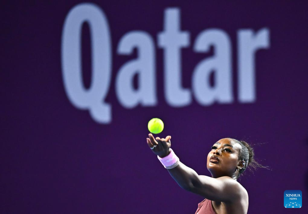 Alycia Parks of the United States serves during the women's singles round of 32 match between Zheng Qinwen of China and Alycia Parks of the United States at the WTA Qatar Open 2026 tennis tournament in Doha, Qatar, on Feb. 10, 2026. (Photo by Nikku/Xinhua)