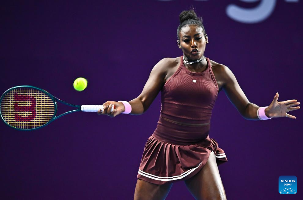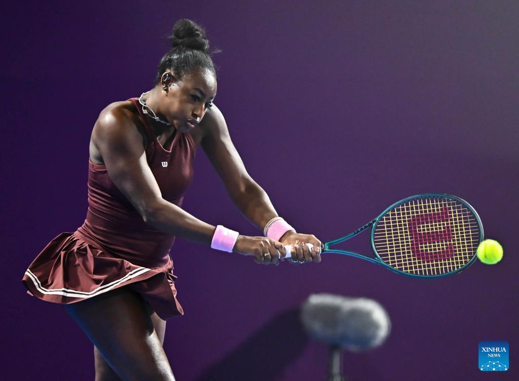 Alycia Parks of the United States hits a return during the women's singles round of 32 match between Zheng Qinwen of China and Alycia Parks of the United States at the WTA Qatar Open 2026 tennis tournament in Doha, Qatar, on Feb. 10, 2026. (Photo by Nikku/Xinhua)