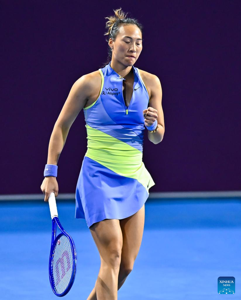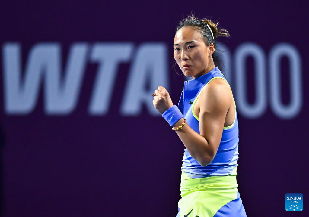 Zheng Qinwen of China celebrates scoring during the women's singles round of 32 match between Zheng Qinwen of China and Alycia Parks of the United States at the WTA Qatar Open 2026 tennis tournament in Doha, Qatar, on Feb. 10, 2026. (Photo by Nikku/Xinhua)