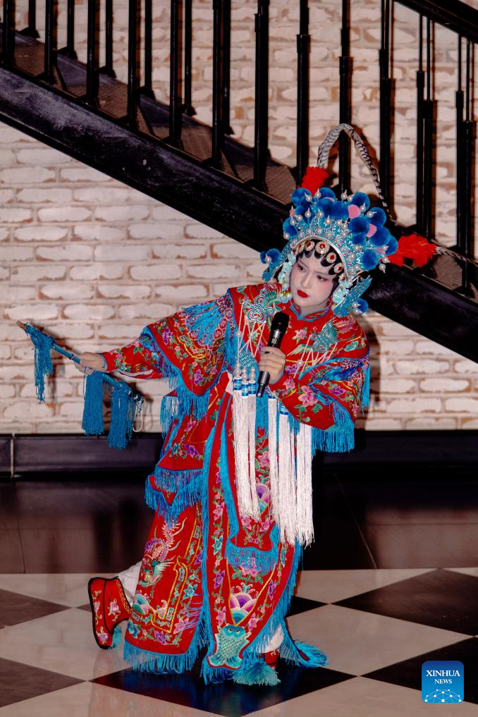A student from the Confucius Institute at Azerbaijan University of Languages performs Peking Opera during a Chinese New Year cultural event at Baku Book Center in Baku, Azerbaijan, Feb. 11, 2026. The Confucius Institute at Azerbaijan University of Languages hosted a Chinese New Year cultural event here on Wednesday. Over 80 local audience joined students from the institute as well as representatives of Chinese-funded enterprises to enjoy performances including classical Chinese poetry recitations, classic Chinese songs, Chinese folk-style dances, and Peking Opera excerpts. (Xinhua/Chen Junfeng)