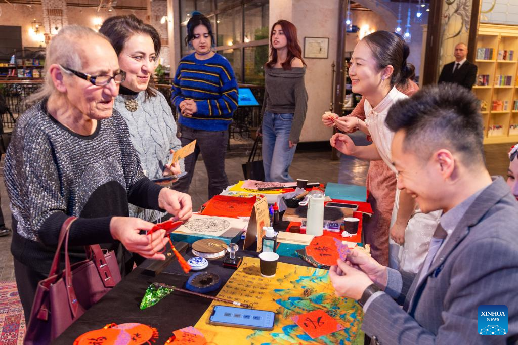 A 90-year-old local woman (1st L) attends a Chinese New Year cultural event at Baku Book Center in Baku, Azerbaijan, Feb. 11, 2026. The Confucius Institute at Azerbaijan University of Languages hosted a Chinese New Year cultural event here on Wednesday. Over 80 local audience joined students from the institute as well as representatives of Chinese-funded enterprises to enjoy performances including classical Chinese poetry recitations, classic Chinese songs, Chinese folk-style dances, and Peking Opera excerpts. (Xinhua/Chen Junfeng)