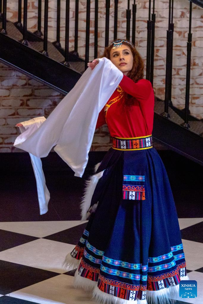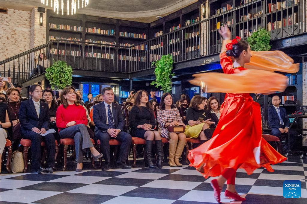 A student from the Confucius Institute at Azerbaijan University of Languages performs Chinese folk dance during a Chinese New Year cultural event at Baku Book Center in Baku, Azerbaijan, Feb. 11, 2026. The Confucius Institute at Azerbaijan University of Languages hosted a Chinese New Year cultural event here on Wednesday. Over 80 local audience joined students from the institute as well as representatives of Chinese-funded enterprises to enjoy performances including classical Chinese poetry recitations, classic Chinese songs, Chinese folk-style dances, and Peking Opera excerpts. (Xinhua/Chen Junfeng)