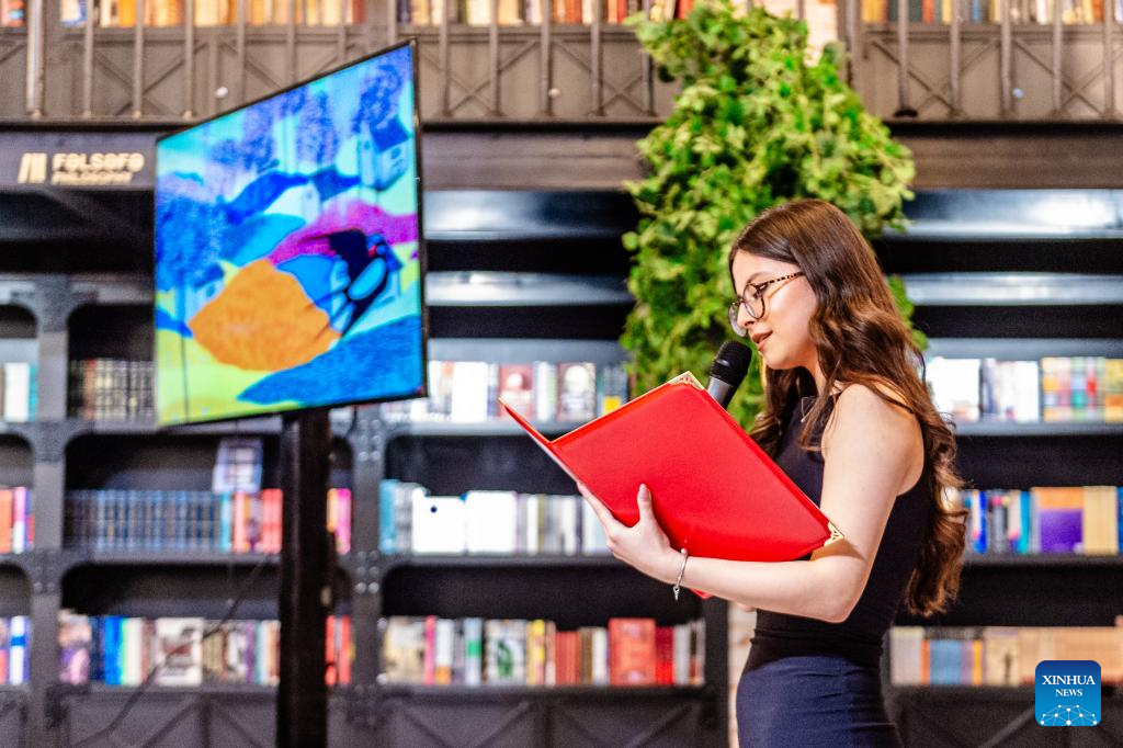 A student from the Confucius Institute at Azerbaijan University of Languages performs Chinese poetry recitation during a Chinese New Year cultural event at Baku Book Center in Baku, Azerbaijan, Feb. 11, 2026. The Confucius Institute at Azerbaijan University of Languages hosted a Chinese New Year cultural event here on Wednesday. Over 80 local audience joined students from the institute as well as representatives of Chinese-funded enterprises to enjoy performances including classical Chinese poetry recitations, classic Chinese songs, Chinese folk-style dances, and Peking Opera excerpts. (Xinhua/Chen Junfeng)