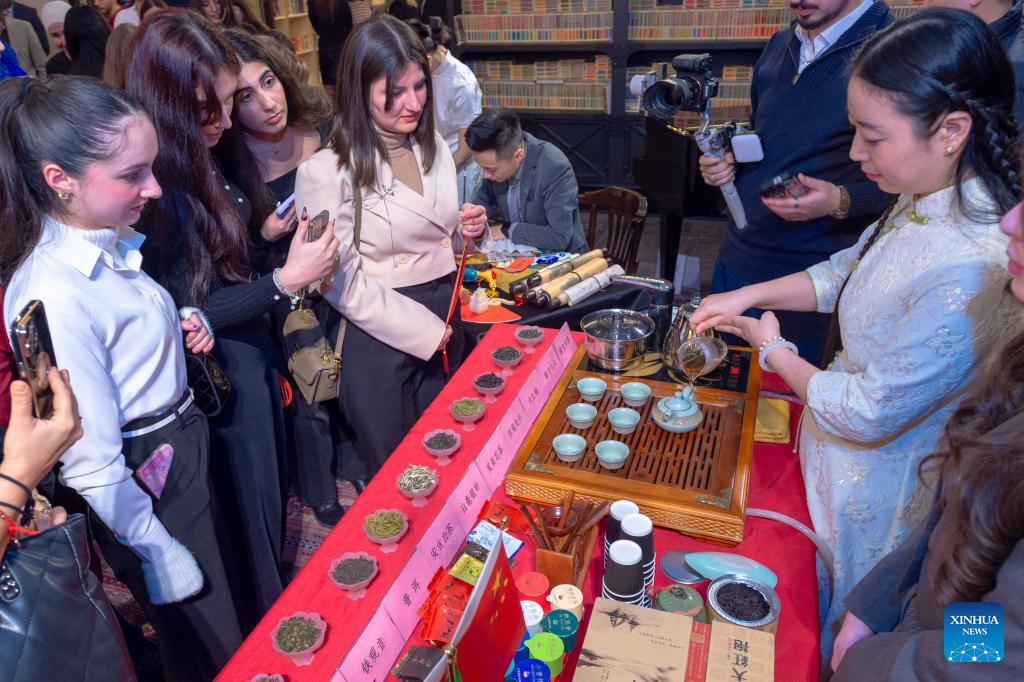 A faculty member from the Confucius Institute at Azerbaijan University of Languages performs traditional Chinese tea ceremony during a Chinese New Year cultural event at Baku Book Center in Baku, Azerbaijan, Feb. 11, 2026. The Confucius Institute at Azerbaijan University of Languages hosted the Chinese New Year cultural event here on Wednesday. Over 80 local audience joined students from the institute as well as representatives of Chinese-funded enterprises to enjoy performances including classical Chinese poetry recitations, classic Chinese songs, Chinese folk-style dances, and Peking Opera excerpts. (Xinhua/Chen Junfeng)