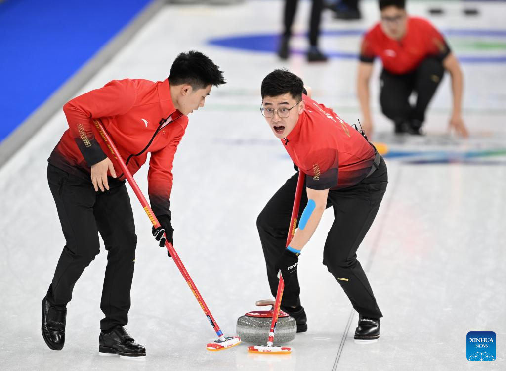 Xu Jingtao (R) of China competes during the curling men round robin session 1 match between China and Britain at the Milan-Cortina 2026 Olympic Winter Games in Cortina, Italy, Feb. 11, 2026. (Xinhua/Lian Yi)