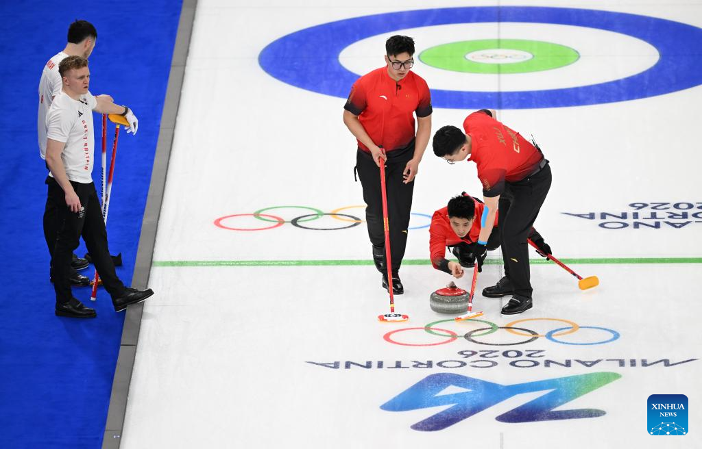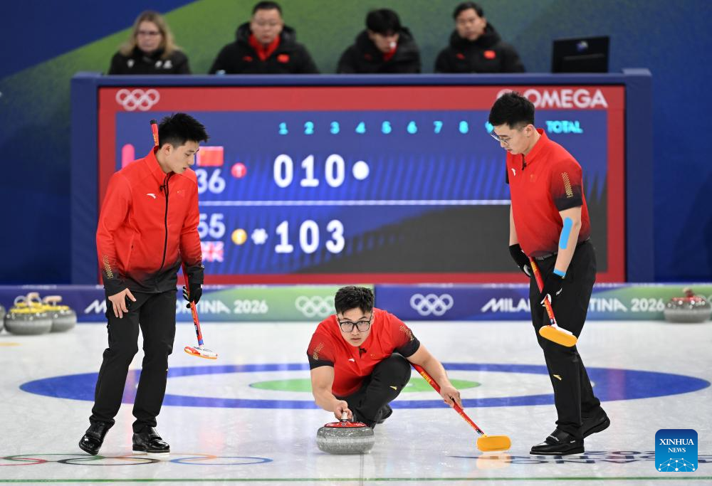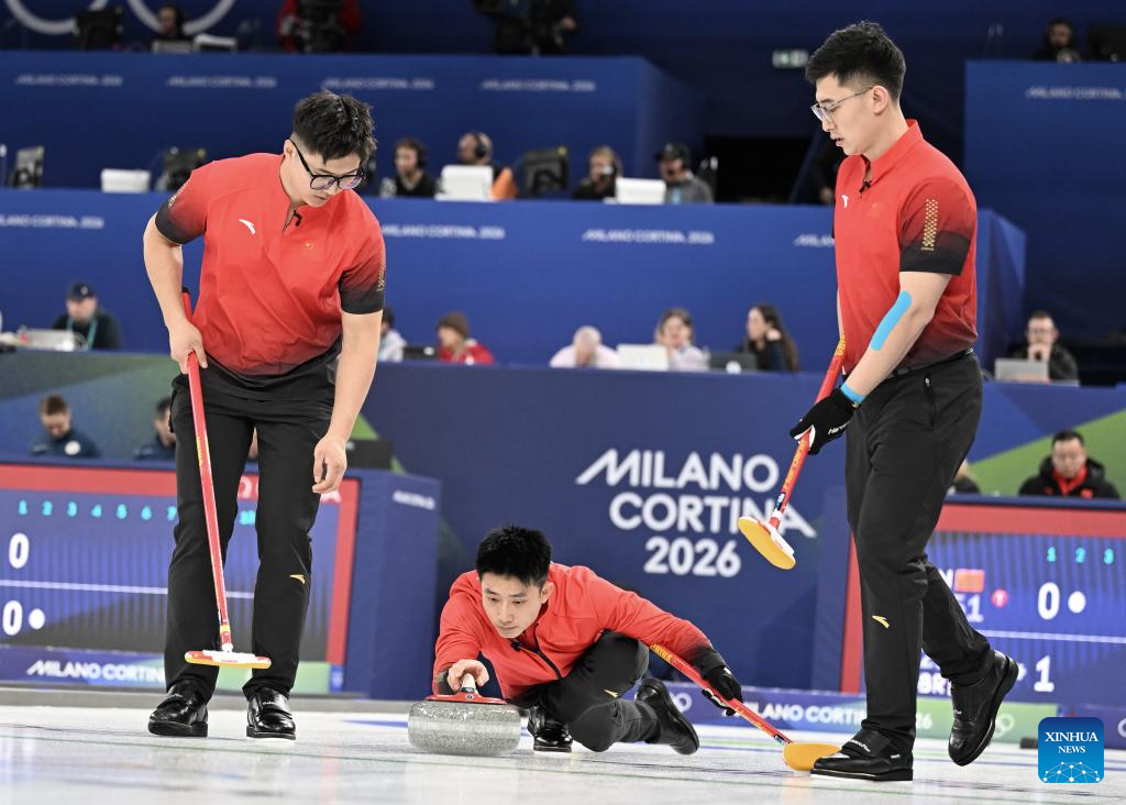 Fei Xueqing (C) of China competes during the curling men round robin session 1 match between China and Britain at the Milan-Cortina 2026 Olympic Winter Games in Cortina, Italy, Feb. 11, 2026. (Xinhua/Lian Yi)