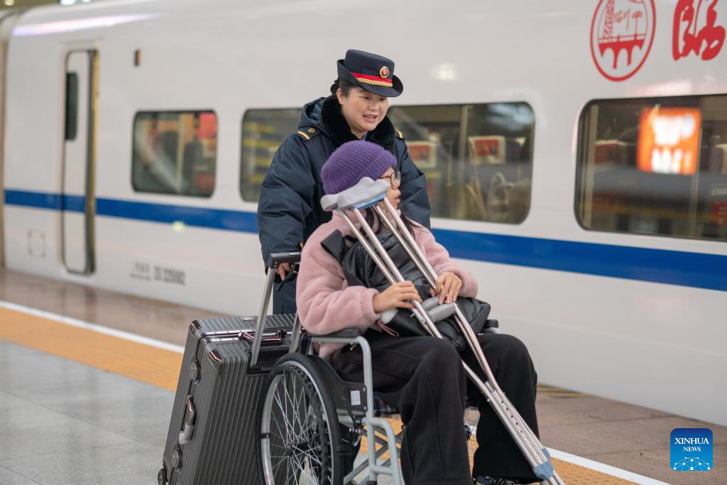 A staff member helps a passenger with mobility impairments get on the train at the Nanchang Railway Station of east China's Jiangxi Province, Feb. 10, 2026.(Xinhua/Guo Jiewen)