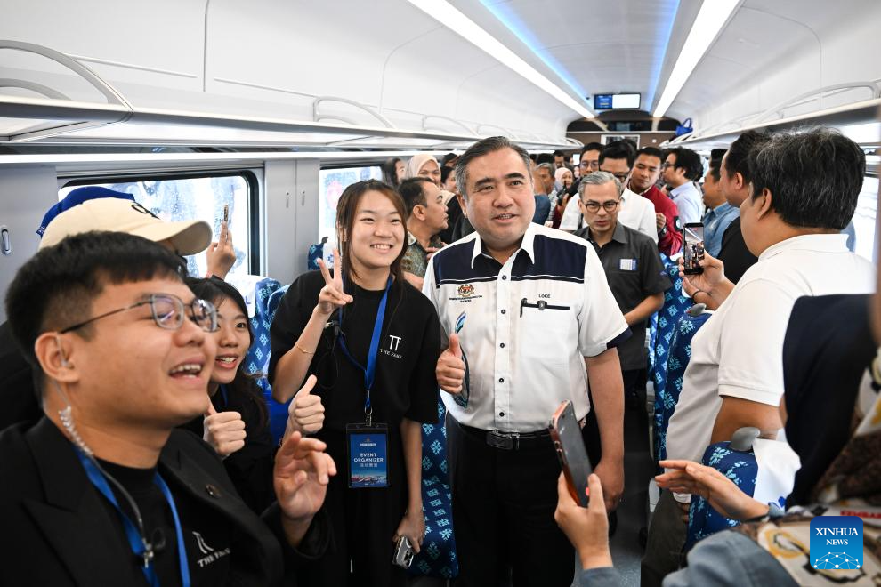 Guests pose for photos with an electric multiple unit (EMU) passenger train in Pahang state, Malaysia, Feb. 11, 2026. As the East Coast Rail Link (ECRL), a mega rail project in Malaysia being built by the China Communications Construction Company (CCCC), moves rapidly towards completion, its first train sets for freight cargo and passengers were unveiled in Pahang state on Wednesday. (Xinhua/Cheng Yiheng)