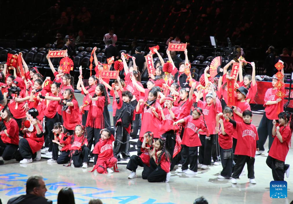 Children extend a greeting of happy Chinese New Year during a performance at Barclays Center in New York, the United States, Feb. 11, 2026. (Xinhua/Zhang Fengguo)