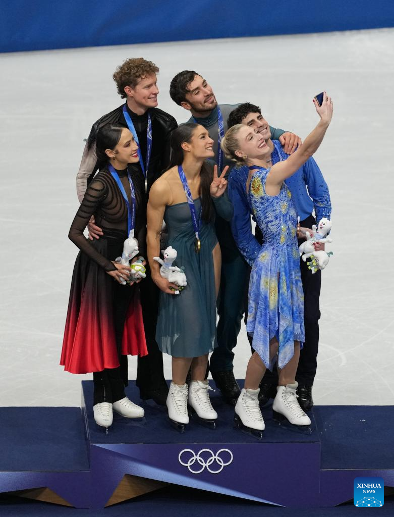 Silver medalists Madison Chock and Evan Bates of the United States, gold medalists Laurence Fournier Beaudry and Guillaume Cizeron of France and bronze medalists Piper Gilles and Paul Poirier of Canada (L to R) take selfies on the podium after the free dance competition of figure skating ice dance at the Milan-Cortina 2026 Olympic Winter Games in Milan, Italy, Feb. 11, 2026. (Xinhua/Xue Yuge)