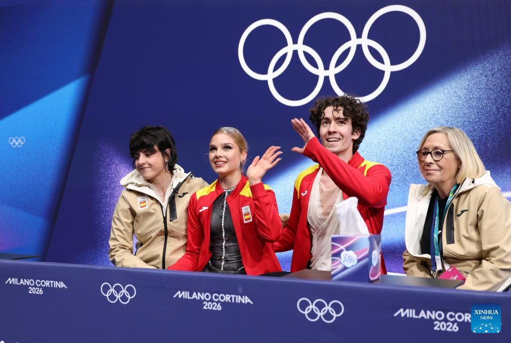 Sofia Val and Asaf Kazimov of Spain react as they wait for the scores during the free dance competition of figure skating ice dance at the Milan-Cortina 2026 Olympic Winter Games in Milan, Italy, Feb. 11, 2026. (Xinhua/Chen Yichen)