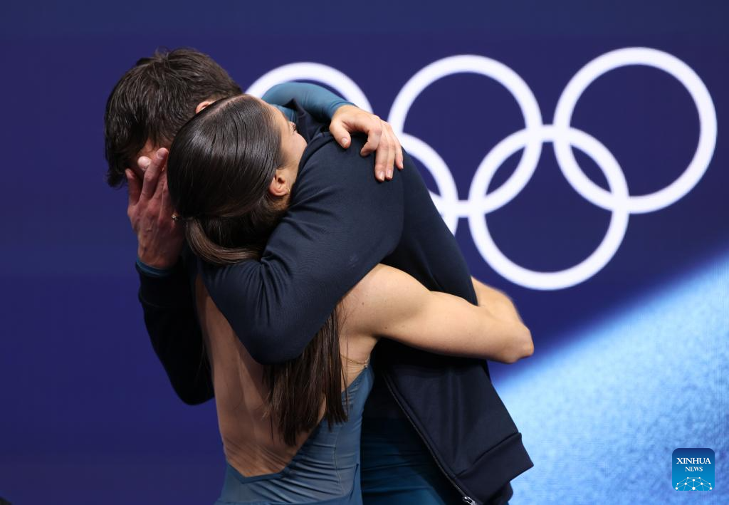 Piper Gilles and Paul Poirier of Canada react during the free dance competition of figure skating ice dance at the Milan-Cortina 2026 Olympic Winter Games in Milan, Italy, Feb. 11, 2026. (Xinhua/Cheng Min)