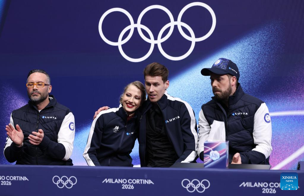 Juulia Turkkila and Matthias Versluis of Finland react as they wait for the scores during the free dance competition of figure skating ice dance at the Milan-Cortina 2026 Olympic Winter Games in Milan, Italy, Feb. 11, 2026. (Xinhua/Chen Yichen)