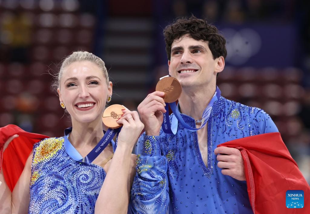 Bronze medalists Piper Gilles and Paul Poirier of Canada pose after the free dance competition of figure skating ice dance at the Milan-Cortina 2026 Olympic Winter Games in Milan, Italy, Feb. 11, 2026. (Xinhua/Chen Yichen)