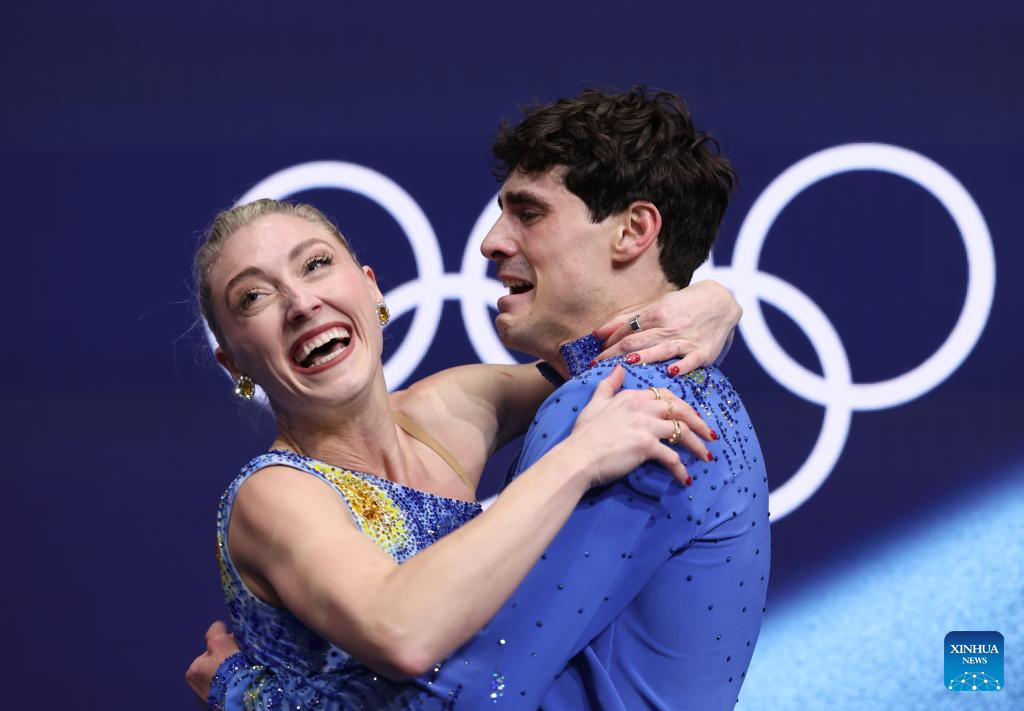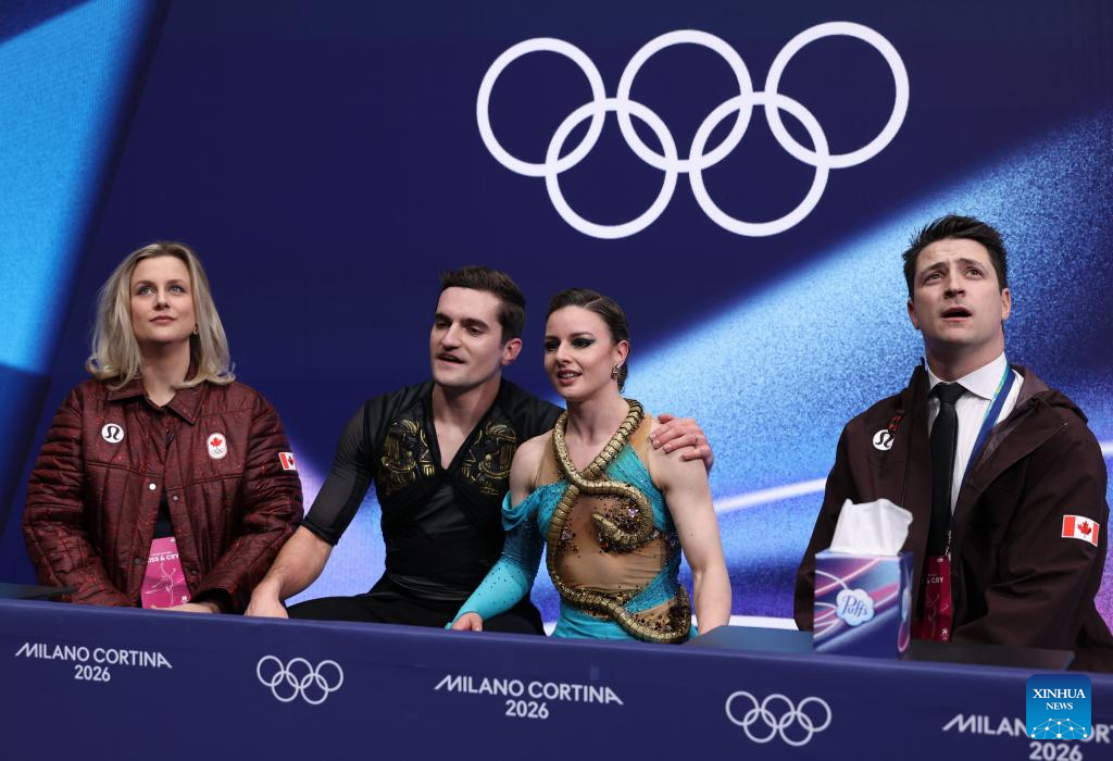 Piper Gilles and Paul Poirier of Canada react as they wait for the scores during the free dance competition of figure skating ice dance at the Milan-Cortina 2026 Olympic Winter Games in Milan, Italy, Feb. 11, 2026. (Xinhua/Chen Yichen)