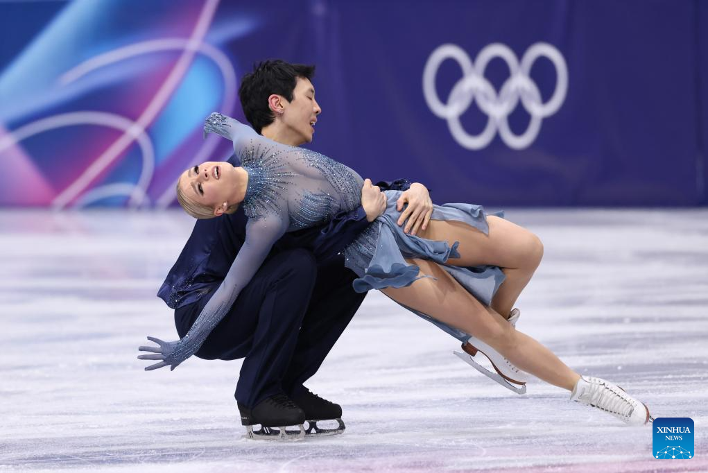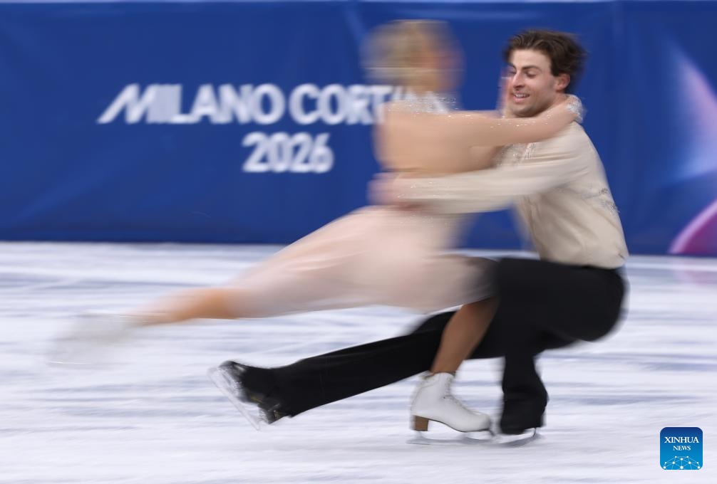 Silver medalists Madison Chock and Evan Bates of the United States perform during the free dance competition of figure skating ice dance at the Milan-Cortina 2026 Olympic Winter Games in Milan, Italy, Feb. 11, 2026. (Xinhua/Cheng Min)