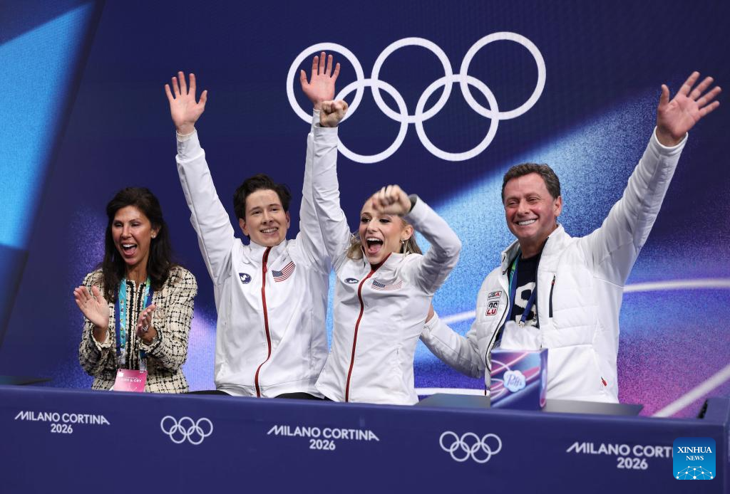 Emilea Zingas and Vadym Kolesnik of the United States celebrate as they wait for the scores during the free dance competition of figure skating ice dance at the Milan-Cortina 2026 Olympic Winter Games in Milan, Italy, Feb. 11, 2026. (Xinhua/Chen Yichen)