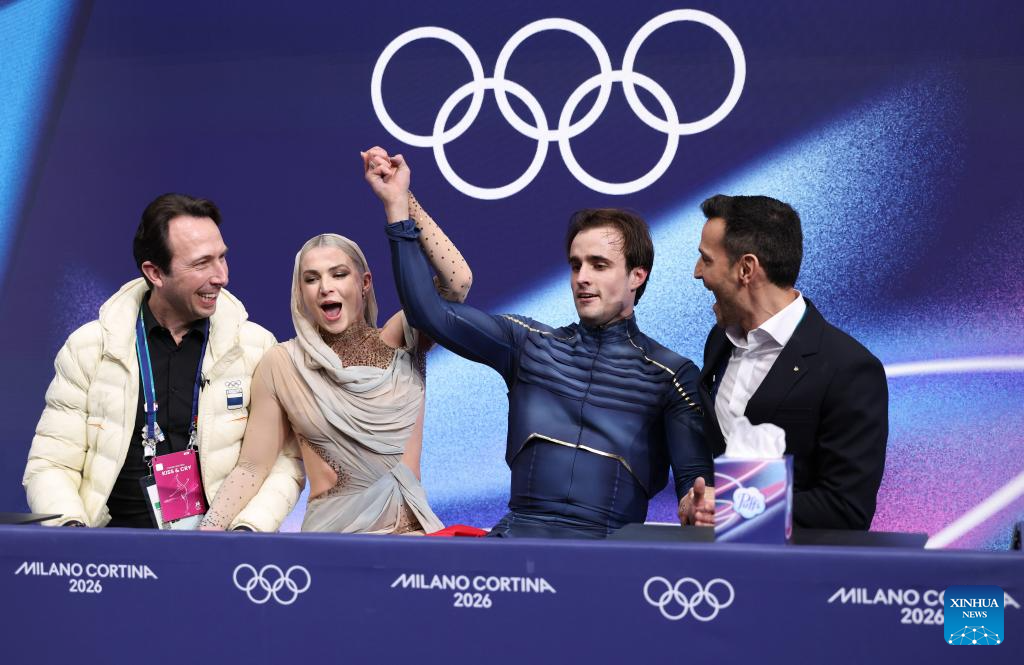 Marjorie Lajoie and Zachary Lagha of Canada react as they wait for the scores during the free dance competition of figure skating ice dance at the Milan-Cortina 2026 Olympic Winter Games in Milan, Italy, Feb. 11, 2026. (Xinhua/Chen Yichen)