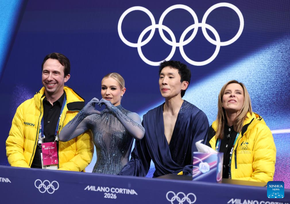 Holly Harris and Jason Chan of Australia react as they wait for the scores during the free dance competition of figure skating ice dance at the Milan-Cortina 2026 Olympic Winter Games in Milan, Italy, Feb. 11, 2026. (Xinhua/Chen Yichen)