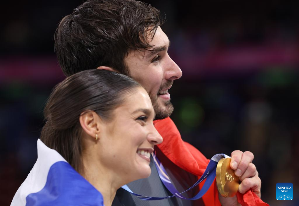 Gold medalists Laurence Fournier Beaudry and Guillaume Cizeron of France pose after the free dance competition of figure skating ice dance at the Milan-Cortina 2026 Olympic Winter Games in Milan, Italy, Feb. 11, 2026. (Xinhua/Chen Yichen)