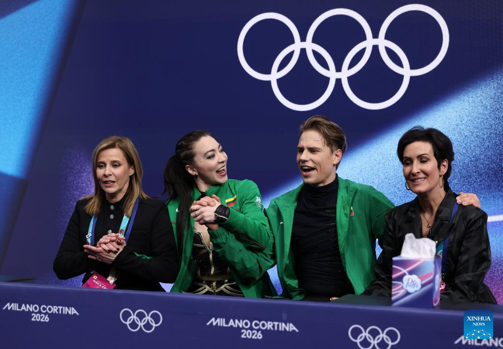 Allison Reed and Saulius Ambrulevicius of Lithuania react as they wait for the scores during the free dance competition of figure skating ice dance at the Milan-Cortina 2026 Olympic Winter Games in Milan, Italy, Feb. 11, 2026. (Xinhua/Chen Yichen)